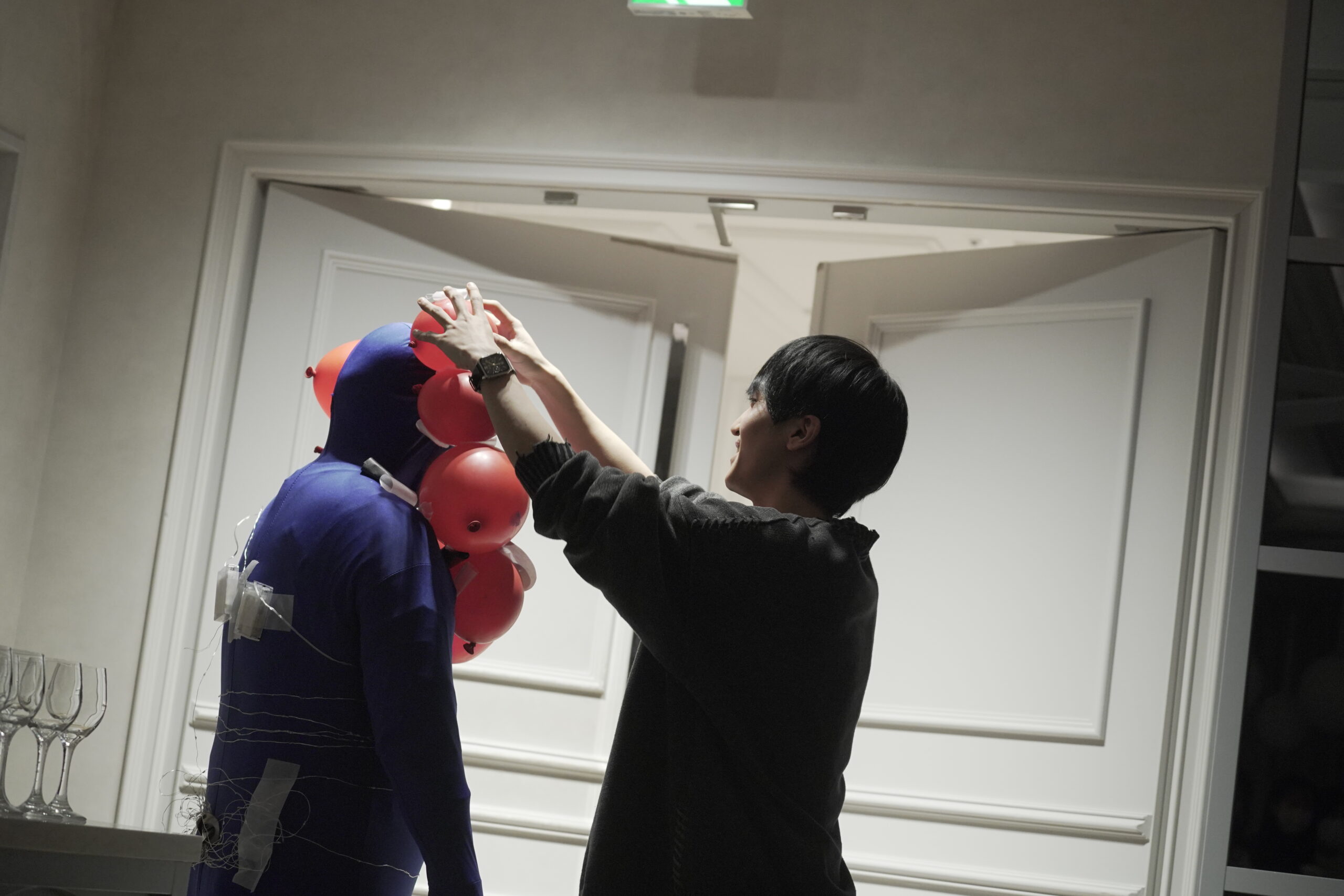 扉から全身真っ青の山川次長が入場し会場にはどよめきが…。笑